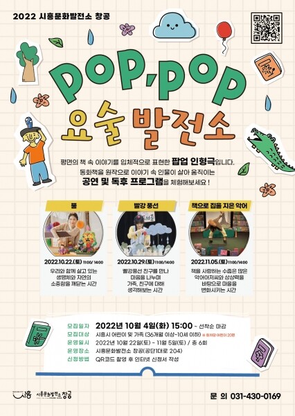 ‘Pop, pop 요술발전소’는 평면의 책 속 이야기를 입체적으로 표현한 팝업 인형극으로 혼자 보는 책, 부모님이 읽어주는 책이 아닌 모두 함께 만들어가는 관객 참여형 문화예술공연이다.