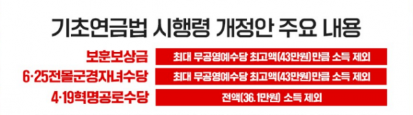 기존에는 국가·독립유공자 등이 보상금을 받는 경우 해당 금액이 소득으로 전액 인정돼 기초연금 대상에서 탈락하거나 연금액이 삭감되는 경우가 있었으나 이번 개정으로 자격요건이 완화돼 연금 수혜자가 늘어날 전망이다.