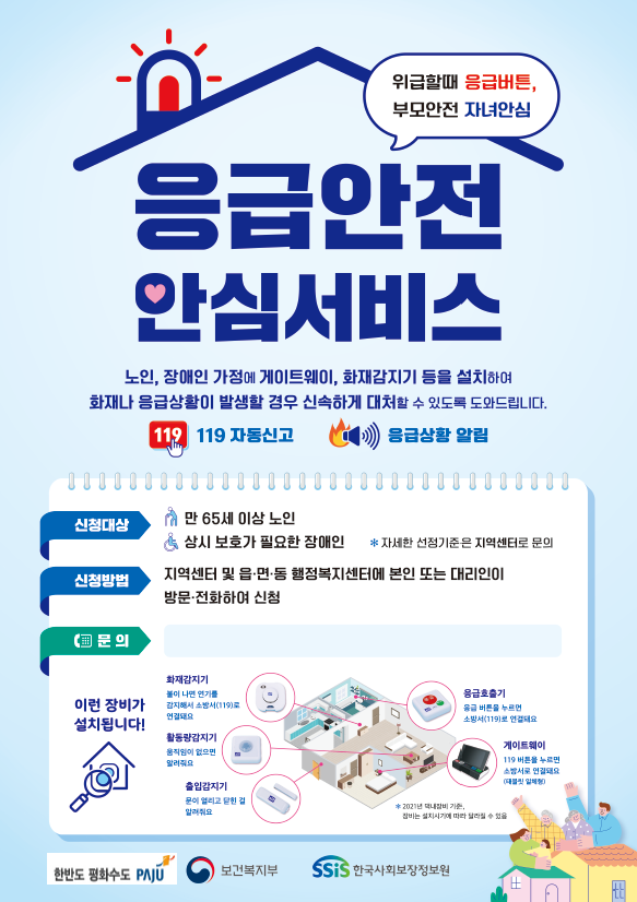 독거노인·장애인 응급안전안심서비스는 만 65세 이상의 국민기초생활수급자, 차상위계층의 독거노인과 장애인활동지원수급자 중 상시 보호가 필요한 가정에 가스·화재·활동감지기 등을 설치하고 최신 ICT를 활용한 모니터링을 통해 응급상황 시 소방서로 신고하는 서비스다.