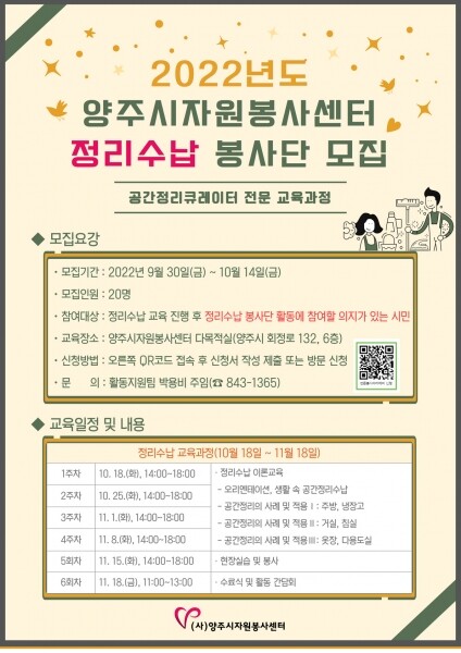 신청을 희망하는 시민은 홍보 안내문 QR코드를 통해 신청하거나 양주시자원봉사센터 홈페이지에서 신청서를 다운 받아 작성한 후 방문 또는 팩스, 이메일로 제출하면 된다.