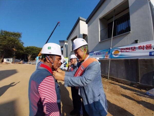 이와 함께 건설현장 근로자들에게 안전모를 씌워주고 턱 끈을 교체하는 등 보호구 착용의 중요성을 다시 한 번 강조했다.