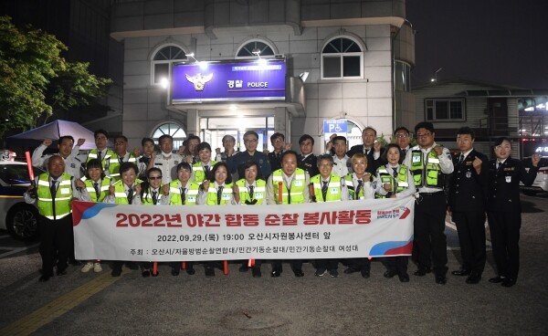 이번 합동 순찰에는 이권재 오산시장, 최기상 자율방범순찰대장, 이영주 민간기동순찰대장, 정경화 민간기동순찰대 여성대장 등 방범단체 대원 30여명이 참여한 가운데 오산지구대를 시작으로 운암단지 인근, 문화의 거리주변 등 안전 취약 지역과 우범지대를 중심으로 1시간 가량 순찰하며 안전을 살폈다.
