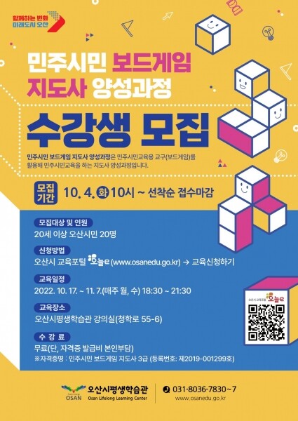 양성과정은 10월 17일부터 11월 7일까지 주 2회 오산시평생학습관에서 진행되며 직장인 학습자들도 참여할 수 있도록 야간강좌로 운영된다.