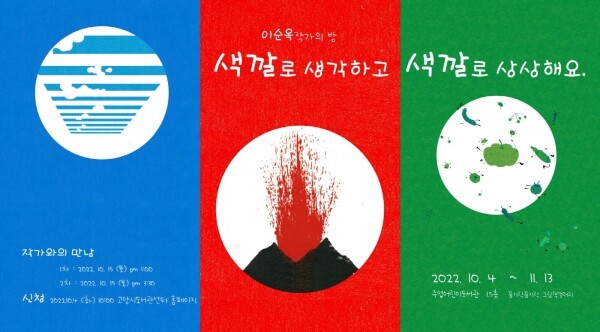 ‘색깔로 생각하고 색깔로 상상해요’라는 주제로 열리는 이번 전시회는 이순옥 작가의 대표작‘하늘 조각’과‘초록초록’,‘빨강’등 그림책 작품을 선보인다.