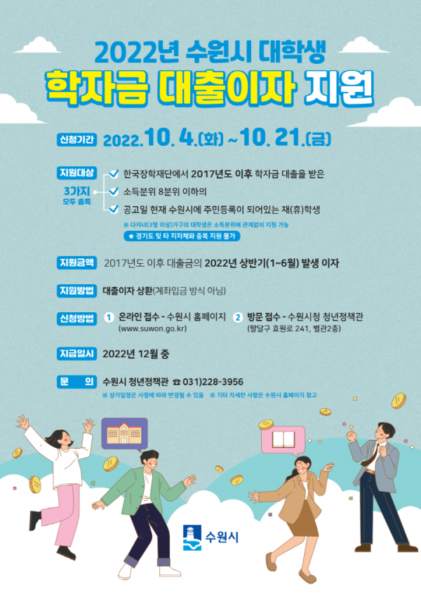 수원시 관계자는 “지난 2017년부터 학자금 대출로 경제적 부담을 안고 있는 대학생을 지속해서 지원하고 있다”며 “청년들에게 실질적인 도움을 줄 수 있는 사업을 계속해서 마련할 것”이라고 말했다.