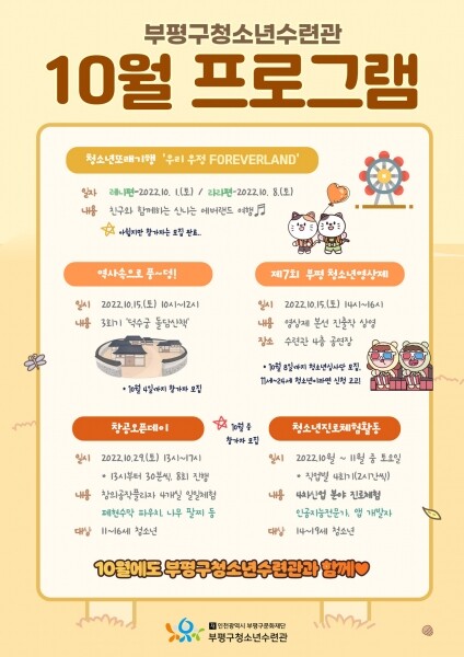 박건호 부평구 청소년수련관장은 “매월 청소년들을 위한 다양한 프로그램을 준비하고 있다”며 “지역 내 청소년들과 주민들의 많은 관심과 참여를 바란다”고 말했다.