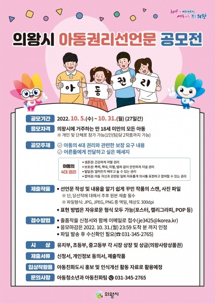 이번 공모전은 의왕시에 거주하는 만 18세 미만의 모든 아동을 대상으로 실시하며 아동이 주체가 되어 스스로 아동권리선언문을 작성해 제출하면 된다.