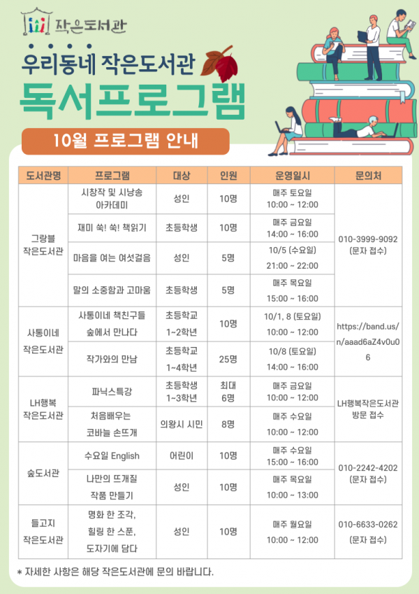 들고지작은도서관 ‘명화 한 조각, 힐링 한 스푼, 도자기에 담다’ 행복작은도서관 ‘파닉스 특강’, ‘처음 배우는 코바늘 손뜨개’, 그랑블작은도서관‘시창작 및 시낭송 아카데미’, ‘재미 쑥 쑥 책 읽기’, ‘마음을 여는 여섯 걸음’, ‘말의 소중함과 고마움’ 숲도서관‘수요일 English’, ‘나만의 뜨개질 작품 만들기’ 사통이네작은도서관‘사통이네 책친구들 숲에서 만나다’, ‘작가와의 만남’을 운영할 예정이다.