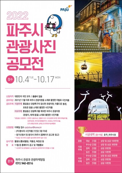 입상작품은 11월 중 파주시 홈페이지 게재 및 개별 통지할 예정이며 향후 관광홍보물 제작, 관광박람회 등 홍보 자료로 다양하게 활용될 예정이다.
