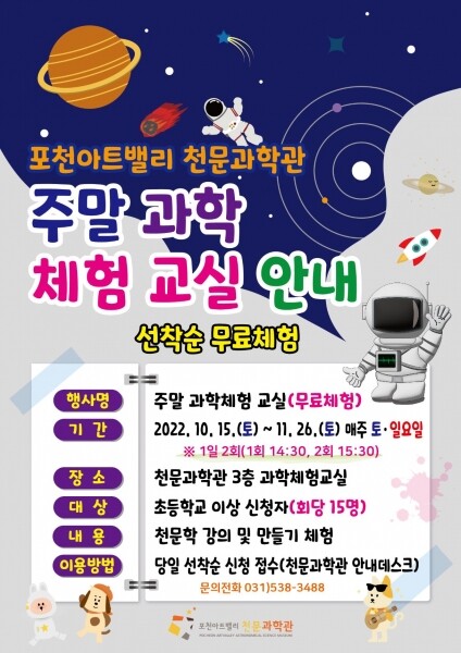 주말 과학체험교실은 시민들의 천문과학 프로그램 요구에 부응하고 학교나 일상에서 접할 수 없는 차별화된 천문과학 프로그램 체험 기회를 제공하기 위해 마련했다.