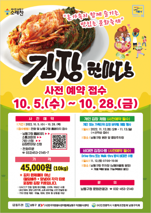 남동구 김장한마당 행사는 최근 2년간 코로나로 인해 비대면 방식으로 진행됐으나 이번에는 가족과 함께 김장을 버무리는 현장 체험행사도 진행된다.