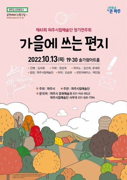이귀순 문화예술과장은 “무덥고 힘들었던 여름을 지나 풍요로운 가을의 문턱에서 아름다운 가을 노을처럼 감성을 채워줄 연주를 통해 파주시민들의 답답한 마음이 조금이나마 치유되길 바란다”고 전했다.