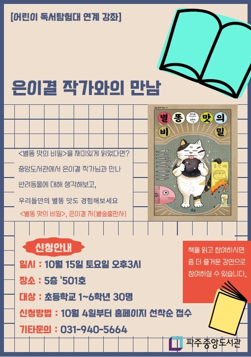 은이결 작가는 이번 작가와의 만남을 통해 ‘우리도 별똥 맛 좀 볼까’라는 주제로 작가라는 직업에 대한 궁금증을 해결하고 반려동물에 대한 생각과 경험을 주제로 독자와 소통하는 시간을 가질 예정이다.