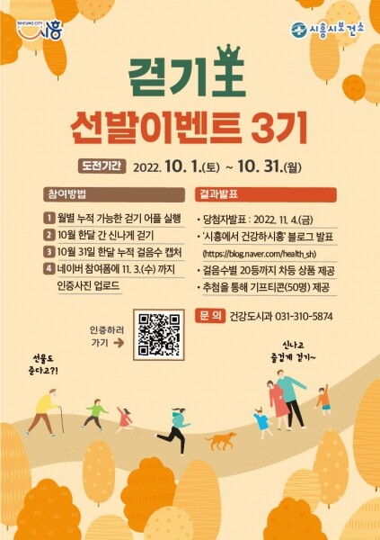 시흥시보건소 관계자는 “가을 정취를 느끼며 즐겁게 운동할 수 있는 걷기왕 이벤트에 주민들의 많은 관심과 참여를 부탁드린다”며 “앞으로도 다양한 건강 프로그램을 마련해 시민들의 건강 문제 개선과 건강 격차 해소에 힘쓰겠다”고 전했다.