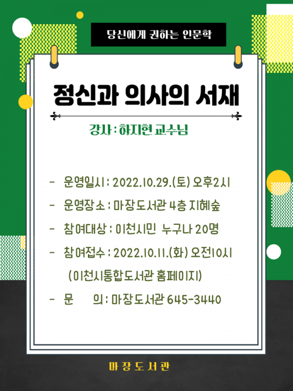 인문학 강연회 관련해서 자세한 내용은 이천시통합도서관 홈페이지에서 확인 가능하며 참여자 접수는 10월 11일부터 홈페이지를 통해 받는다.