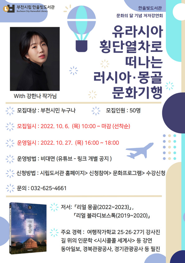 수강신청은 10월 6일 오전 10시부터 부천시립도서관 홈페이지 수강신청, 전화, 한울빛도서관 방문신청의 방법으로 할 수 있다.