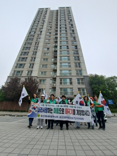 이미옥 송산3동 새마을부녀회장은 “나라사랑의 소중함을 되새기고자 이번 태극기 달기 운동을 전개했으며 입주민의 관심과 협조에 감사하다”고 말했다.