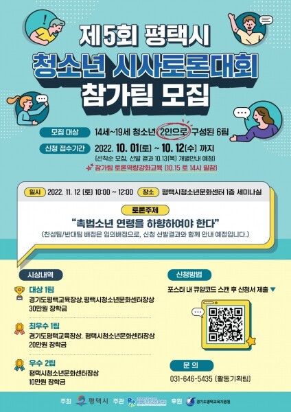 평택시 청소년 시사토론대회는 청소년들이 토론대회를 통해 현대사회의 문제들을 발견하고 이를 해결하기 위한 방안들을 제시하는 활동으로 ‘촉법소년의 연령을 하향해야 한다’를 주제로 11월 12일 평택시청소년문화센터에서 진행될 예정이다.