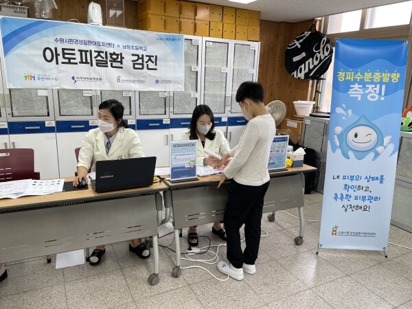 수원시환경성질환아토피센터 소속 간호사가 학생들의 피부를 검사해 경피수분증발량을 측정하고 소아과 전문의인 아토피센터 부센터장이 아토피피부염 증증도를 평가했다.