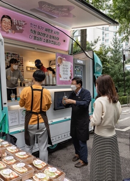 만난 지 100일 된 ‘좋은 친구’ 김 구청장이 커피차 앞에서 앞치마를 두르고 커피와 샌드위치를 나눠주며 직원들과의 만남을 가졌기 때문이다.