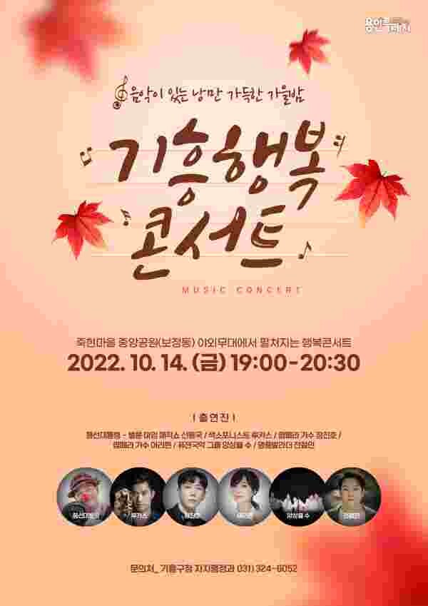 구 관계자는 "음악과 함께 가을밤 정취를 만끽할 수 있는 기흥행복콘서트에 많은 구민들이 참여해 주시길 기대한다"며 "앞으로도 시민들이 많은 공원이나 광장으로 찾아가 공연을 선사하는 기흥행복콘서트를 이어나갈 계획이라고 전했다"고 말했다.