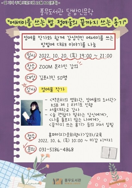강연 접수는 10월 6일 목요일 오전 10시부터 풍무도서관 홈페이지에서 가능하며 선착순 50명을 모집한다.