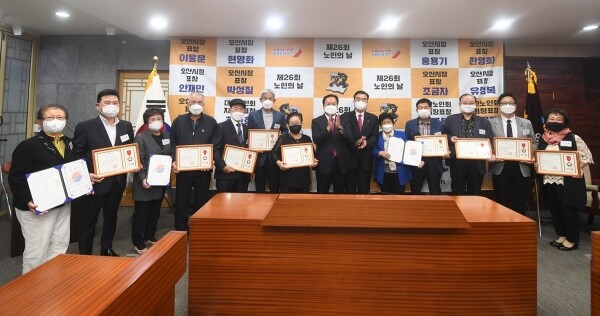 시상식에는 이권재 오산시장, 신건호 대한노인회 오산시지회장이 시상자로 참석한 가운데 코로나19 장기화 속에 경로당 방역 활동, 긴급 지원사업, 도시락배달 지원사업 등 다양한 노인복지 분야에서 헌신한 모범 노인, 노인복지 기여자 12명이 표창을 받았다.
