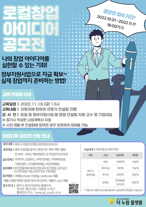 공모전과 관련한 자세한 내용 확인과 지원서 양식은 광주시 청년지원센터 누리집에서 확인이 가능하다.