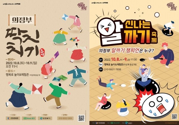 10월 8일 ~ 10월 9일 오전 11시, 행복로 ‘놀이와 체험 공간’에서 딱지치기·알까기 대회가 열려 방문객 누구나 참여 가능한 전통놀이를 통해 어른들과 아이들이 정서적 유대감을 쌓을 수 있는 시간이 펼쳐진다.