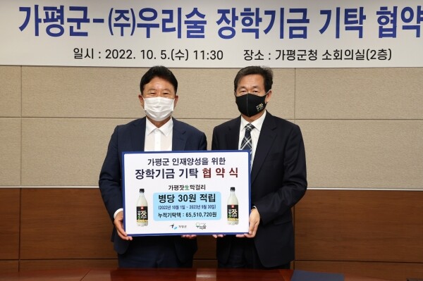 가평군과 ㈜우리술의 장학기금 기탁 협약은 2017년 2월 첫 협약 이후 매년 연장되어 이번이 7번째 협약이며 협약에 따라 ㈜우리술은 ‘가평生잣막걸리’ 판매량 병당 30원을 적립해 반기별로 가평군에 장학기금으로 기탁하게 된다.
