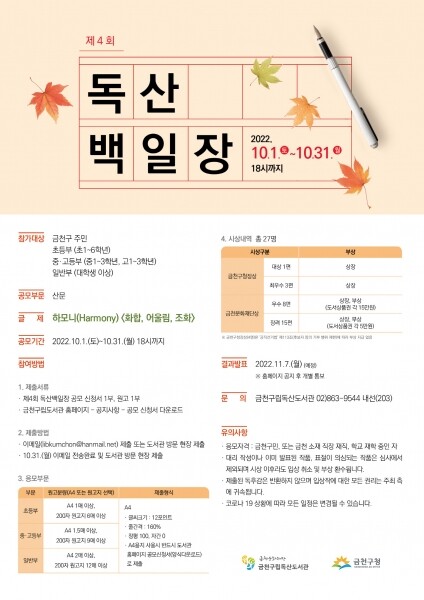 결과는 11월 7일 금천구립도서관 홈페이지를 통해 발표할 예정이다.