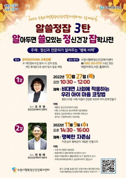 수원시 관계자는 “코로나19 이후 비대면 문화가 확산되면서 많은 사람이 대인관계에 어려움을 겪고 있다”며 “대인관계 형성에 대한 어려움으로 인한 혼란, 자존감·자신감 하락을 겪고 있는 시민들을 위해 알쓸정잡 3탄 강좌를 준비했다”고 말했다.