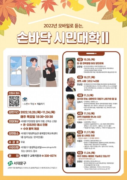 이성헌 서대문구청장은 “민주주의의 원리와 제도, 그리고 여러 사회 이슈에 대한 이해를 넓히는 데 초점을 두고 이번 시민대학 과정을 구성했다”고 말했다.