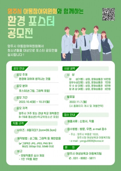 시 관계자는 “양주시 아동의 대표인 아동참여위원회가 직접 기획한 이 행사에 많은 아동이 참여해 참신한 환경포스터 작품으로 각자가 가진 생각과 재능을 뽐내고 ‘아동의 직접 참여’라는 의미를 더욱 빛나게 하는 기회가 될 수 있기를 기대한다”고 말했다.