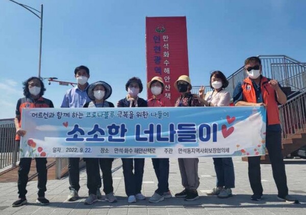 만석동 지역사회보장협의체 위원들은 먼 거리 여행이 어려운 어르신들과 함께 만석·화수 해안산책로를 거닐고 가을바람을 맞으며 산책과 식사를 했다.
