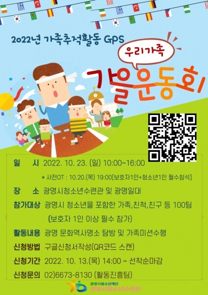 올해는 ‘우리가족 가을운동회’를 주제로 10월 23일 오전 10시부터 오후 4시까지 광명시 명소에서 주제에 맞는 다양한 활동을 펼칠 예정이다.