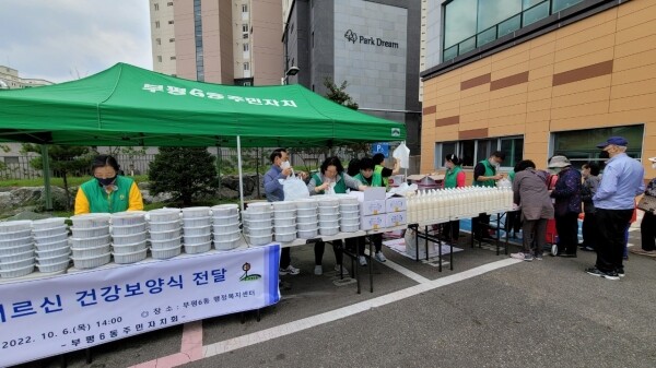 서정옥 부평6동 새마을부녀회장은 “회원들이 정성껏 만든 음식으로 어르신들에게 따뜻한 마음을 전할 수 있어 기쁘다”며 “앞으로도 주변 이웃들에게 지속적인 관심과 사랑을 베풀며 더불어 사는 행복한 우리 동네를 만드는 데 앞장서겠다”고 말했다.