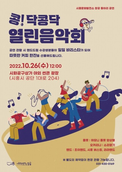 공연 당일에는 시흥문화발전소 창공에서 진행된 ‘콩닥콩닥 핸드드립’ 교육 수료생이 일일 바리스타가 돼 특별한 ‘핸드드립 커피 시음회’를 운영하는 부대행사가 마련된다.