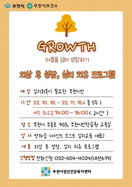조용익 부천시장은 “트라우마 치유 프로그램을 통해 참여자들이 함께 공감하고 위로하는 시간이 되길 바라며 개인의 시련이나 고난을 극복해 의미와 가치를 발견하는 성장의 기회가 되길 바란다”고 전했다.