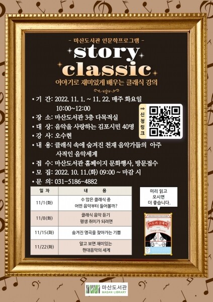 마산도서관은 11월 1일부터 22일까지 매주 화요일 오전 10시부터 정오까지 두 시간에 걸쳐 인문학프로그램 ‘스토리클래식’을 운영한다.