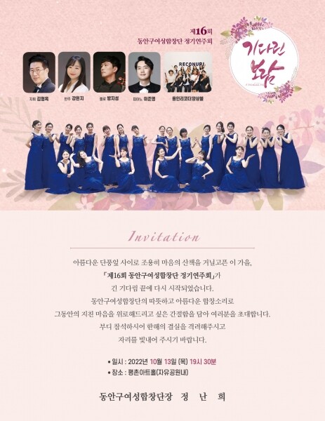 이충건 동안구청장은 “동안구여성합창단의 제16회 정기연주회를 축하하며 지난 2년간 코로나19로 지친 시민들의 삶에 따뜻한 위로와 감동을 전하는 무대로 오래 기억되기를 기대한다”며 시민들의 많은 관람을 당부했다.