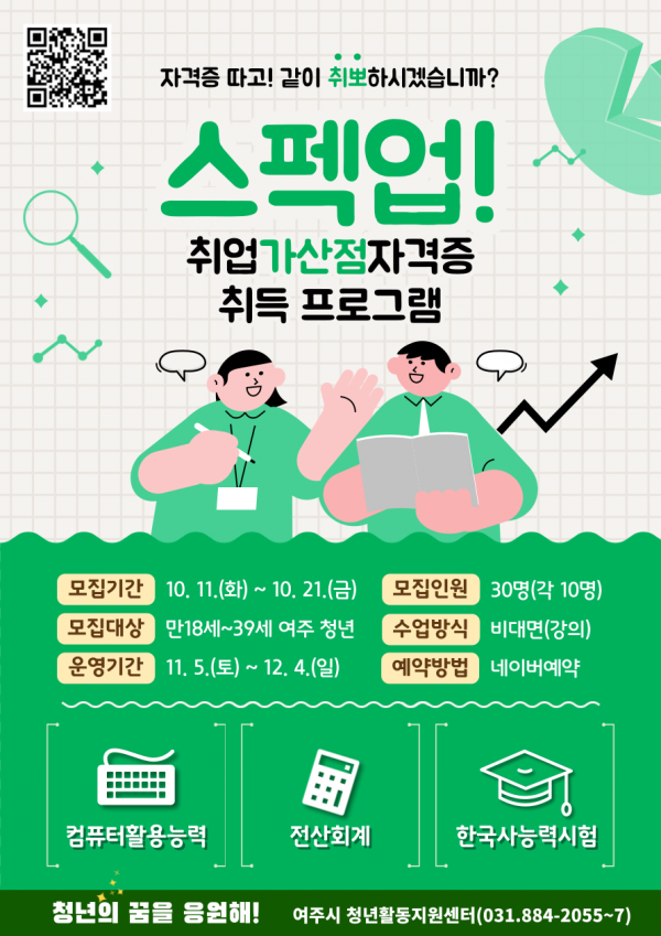 여주시 청년활동지원센터 관계자는 “취업 준비에 어려움을 겪고 있는 청년, 사회 초년생인 청년들이 이번 자격증 취득 프로그램을 통해 효율적으로 업무를 수행하고 취업 준비 시 가산점을 받을 수 있는 자격증을 취득해 경쟁력을 강화하고 자격 취득을 통해 취업 준비에 조금이나마 도움이 되기를 바란다”고 말했다.