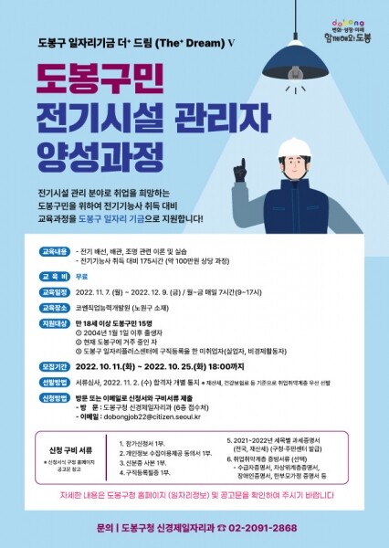 도봉구민 전기시설관리자 양성과정 참여자로 선발되면 전기기능사 준비를 위한 100만원 상당의 교육과정을 무료로 수강할 수 있다.
