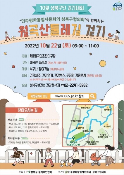 성북구 걷지우연합회가 주최하고 민주평화통일자문회의 성북구협의회가 주관하는 이번 걷기대회는 22일 오전 9시 제1월곡인조잔디구장에서 출발, 월곡산의 아름답게 물들어가는 가을길을 감상하며 약 2km, 40여 분 소요 코스로 걷게 된다.