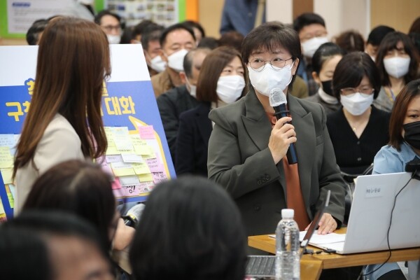 대화는 줌 화상회의에 올라온 실시간 댓글과 직원들이 포스트잇에 작성한 질문메모들에 대해 구청장이 답변하는 방식으로 진행됐다.
