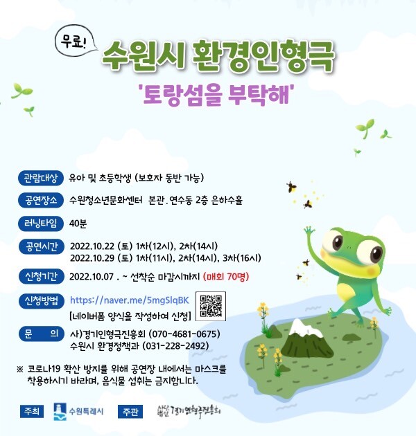 수원시 관계자는 “‘토랑섬을 부탁해’는 수원지역의 야생 생물들이 나오는 환경인형극으로 어린이들이 생물다양성을 쉽게 이해할 수 있도록 제작했다”며 “생태적 감수성을 기를 수 있도록, 많은 어린이가 관람하길 바란다”고 말했다.