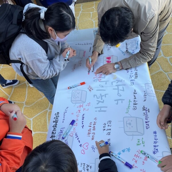 학생들은 깍두기가 그려진 현수막에 자신이 생각하는 학교폭력 예방 문구를 적으며 행복한 학교 만들기에 동참한다.