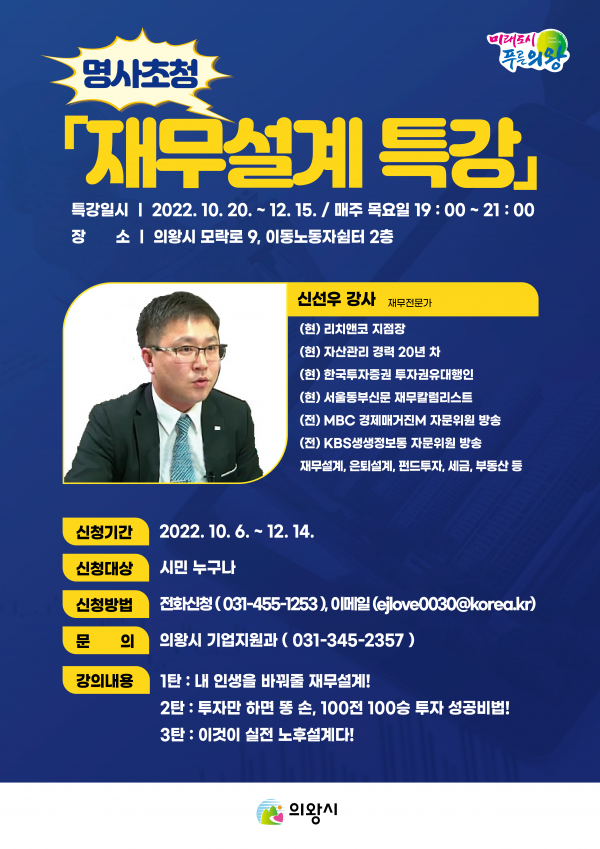강의는 10월 20일부터 12월 15일까지 매주 목요일 오후 7시부터 9시까지 두 시간 동안 진행되며 수강신청은 의왕시민이면 누구나 상시 신청이 가능하다.