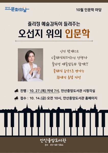 강연 접수는 14일 오전 10시부터 안산중앙도서관 누리집 문화강좌 게시판에서 신청 가능하며 자세한 사항은 전화로 문의하거나 중앙도서관 누리집에서 확인하면 된다.