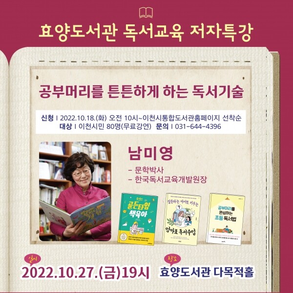 강의 접수는 10월 18일 화요일 오전 10시부터 이천시통합도서관 홈페이지’문화행사’효양도서관 강좌에서 가능하며 선착순 80명을 모집한다.